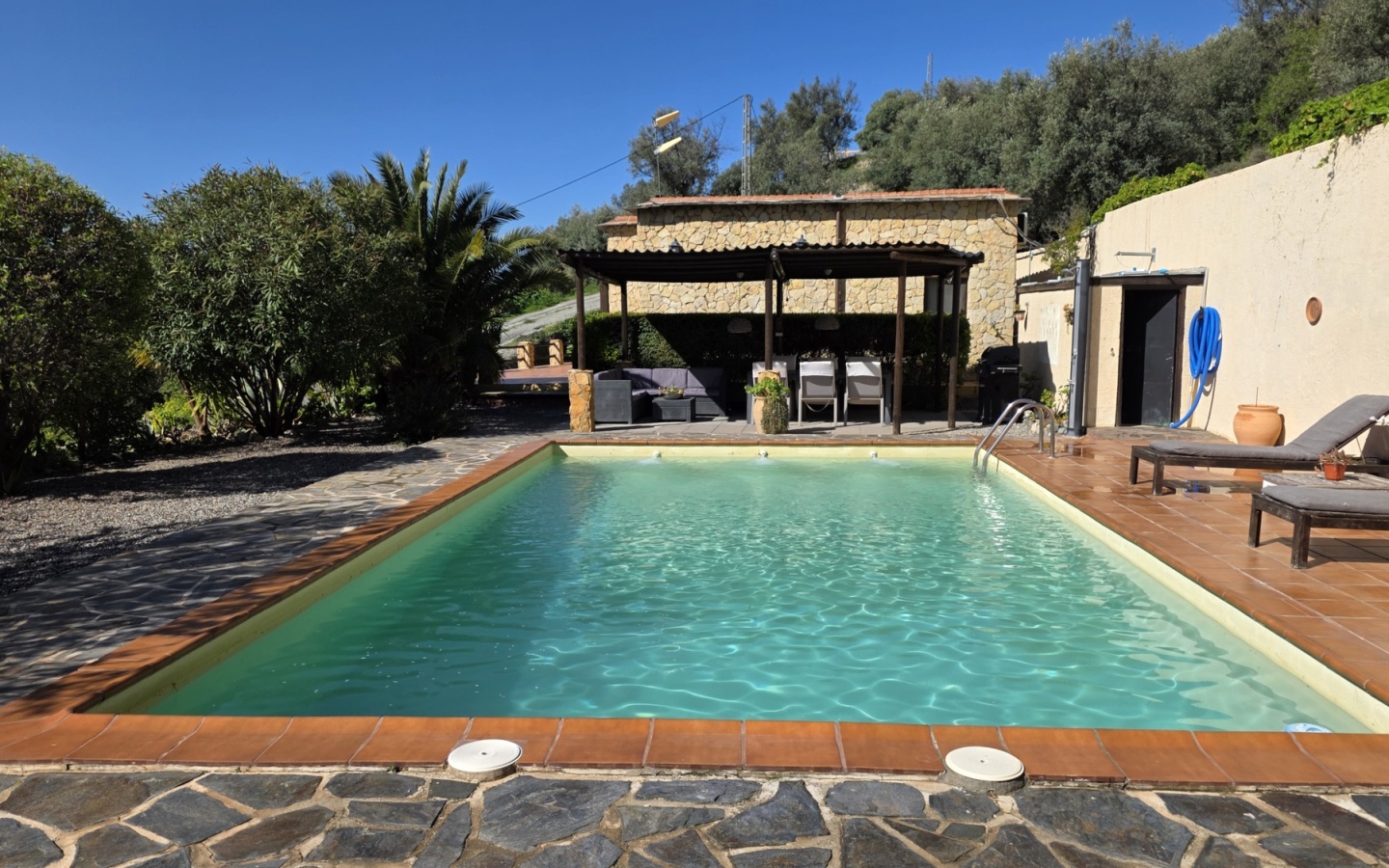 The estate is a feast for the senses. Surrounded by a Mediterranean garden with olive, fig, almond, pomegranate, and lemon trees, the property guarantees complete privacy. The heart of outdoor living is its impressive 9x5 m swimming pool, flanked by spacious terraces and porches designed to capture every ray of sunshine or offer respite in the cool shade during summer evenings.