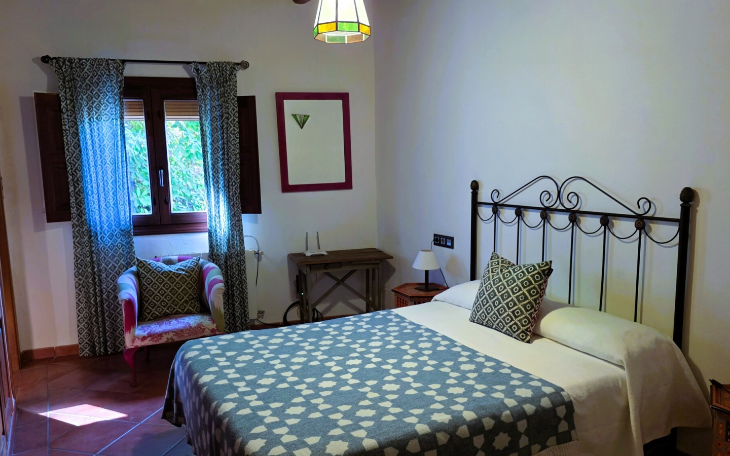 Master Bedroom: Spacious and full of personality, it stands out for its wrought-iron headboard, a solid wood wardrobe with latticework, and vibrant bedding.