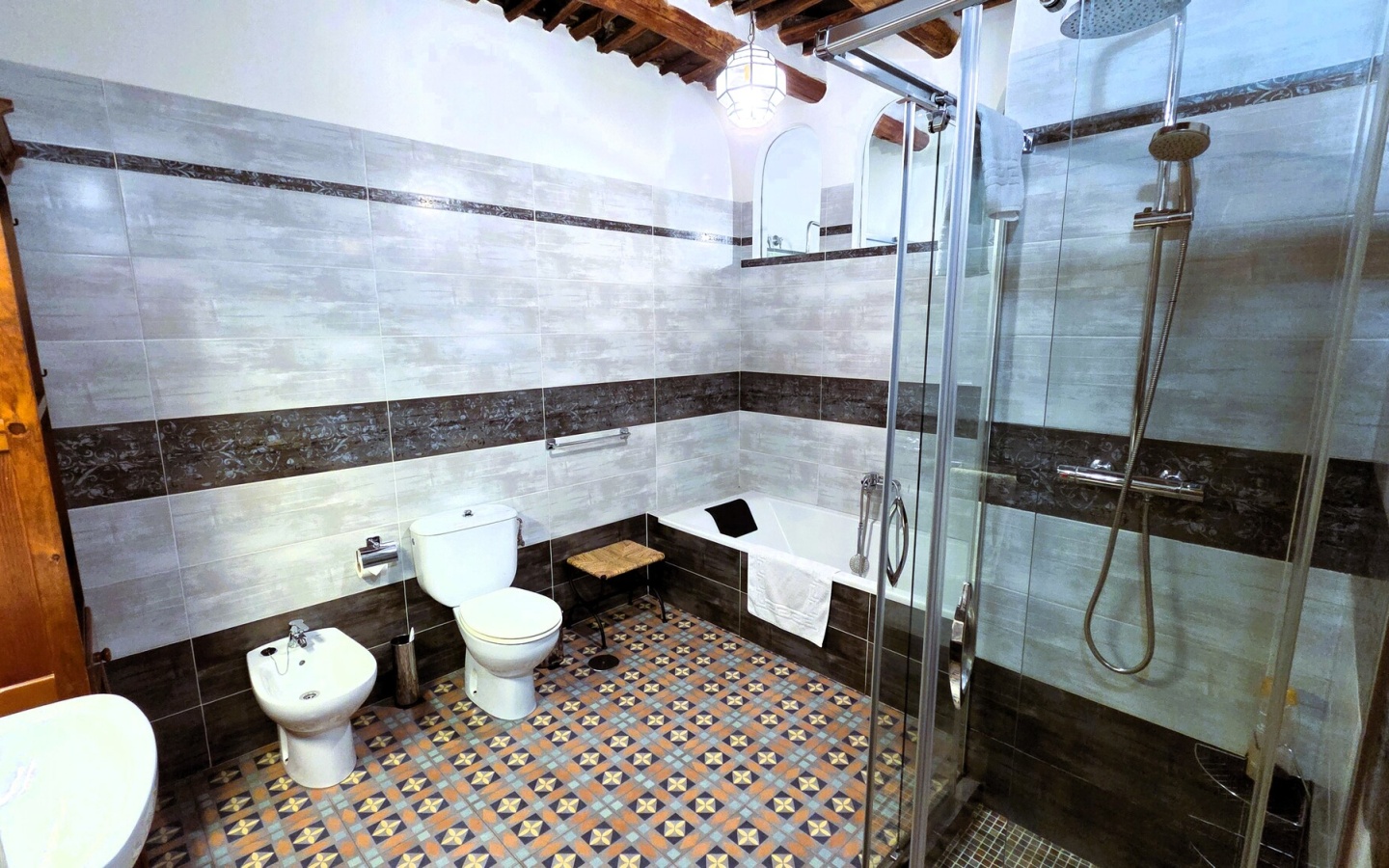 Bathroom 1: A spacious bathroom with a separate shower and bathtub. It stands out for its gray and white tiled walls with a decorative stripe, and a striking mosaic floor. It includes a toilet and bidet.